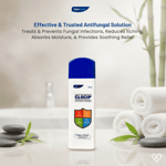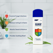 Clocip Dusting Powder 100gm is an effective antifungal treatment that combats skin fungal infections by targeting and destroying fungal cells. Its powder form helps absorb moisture, reduce itching, and prevent infection recurrence, making it ideal for fungal conditions in moist and sweat-prone areas.