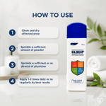 - Apply a thin layer of Clocip Dusting Powder over the affected skin.