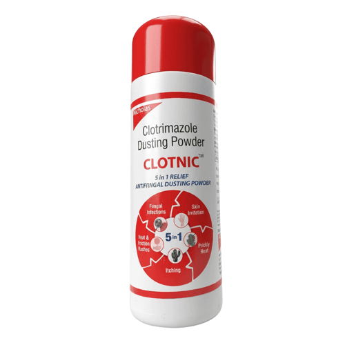 Clotnic Dusting Powder contains Clotrimazole, a broad-spectrum antifungal agent that belongs to the imidazole class of medicines. It works by damaging the cell membrane of fungi. Clotrimazole inhibits the production of ergosterol, an essential component of the fungal cell membrane. Without ergosterol, the fungal cell membrane becomes weak and leaky, leading to the death of the fungus. By eliminating the fungal organism, Clotnic Powder reduces symptoms such as itching, redness, burning sensation, skin irritation, scaling, and rashes. Its dusting powder base also helps absorb excess moisture and sweat, which creates an unfavorable environment for fungal growth. This dual action—antifungal activity plus moisture control—makes it highly effective for treating conditions like ringworm infection, athlete’s foot, jock itch, and candidal skin infections.