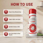 - Gently sprinkle a thin layer of Clotnic Dusting Powder over the affected skin.
