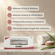 Lulinic 1% Cream contains luliconazole, a broad-spectrum imidazole antifungal agent. It works by inhibiting the synthesis of ergosterol, an essential component of fungal cell membranes. Without ergosterol, the fungal cell membrane becomes weak and damaged, ultimately leading to fungal cell death. By disrupting the fungal growth cycle, the cream helps relieve symptoms like itching, redness, scaling, cracking skin, and inflammation. It is particularly effective against dermatophytes responsible for ringworm (tinea corporis), jock itch (tinea cruris), and athlete’s foot (tinea pedis). Unlike some antifungal treatments that require prolonged use, luliconazole often shows improvement within a few days when used regularly as prescribed. However, completing the full course is essential to prevent recurrence and resistance.