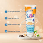 Personal Care Whole Body Deodorant Cream Peach & Vanilla Blossom 113gm is a dermatologist-tested deodorant cream designed for comprehensive, all-day odor protection. It delivers refreshing peach and vanilla blossom fragrance, providing gentle care for delicate and sensitive regions including underarms, underboobs, thighs, feet, and intimate areas.