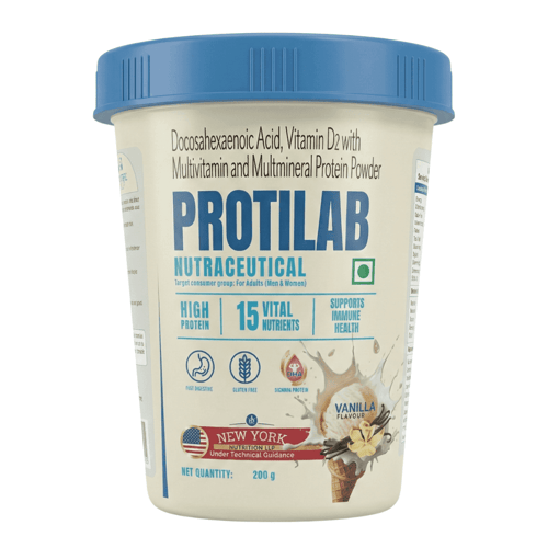 Many people experience protein and micronutrient deficiencies without realising it, which can silently affect daily health and strength. Protein deficiency may lead to muscle weakness, slow recovery, low stamina, poor immunity, hair fall, and fatigue, while Vitamin D deficiency can cause bone pain, weak bones, joint discomfort, and frequent illness. Similarly, DHA deficiency may impact brain function, memory, focus, and mood. Protilab Vanilla Flavour Protein Powder helps provide nutritional support by supplying high-quality protein along with Vitamin D2, DHA, and essential vitamins and minerals to manage these common deficiencies and improve overall wellness.