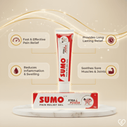 Sumo Gel Fast Relief for Muscle & Joint Pain is a topical pain relief gel formulated with powerful ingredients like Diclofenac, Methyl Salicylate, Menthol, and Linseed Oil that provide fast and effective relief from muscle and joint pain, inflammation, stiffness, and swelling. It is widely used for managing pain related to arthritis, sprains, strains, back pain, neck pain, and other musculoskeletal conditions. The gel delivers a soothing cooling effect followed by warming sensations that help disrupt pain signals, allowing you to move comfortably and regain flexibility. Its non-greasy, fast-absorbing formula targets the affected area directly, minimizing discomfort and promoting faster recovery without the side effects of oral pain medications.